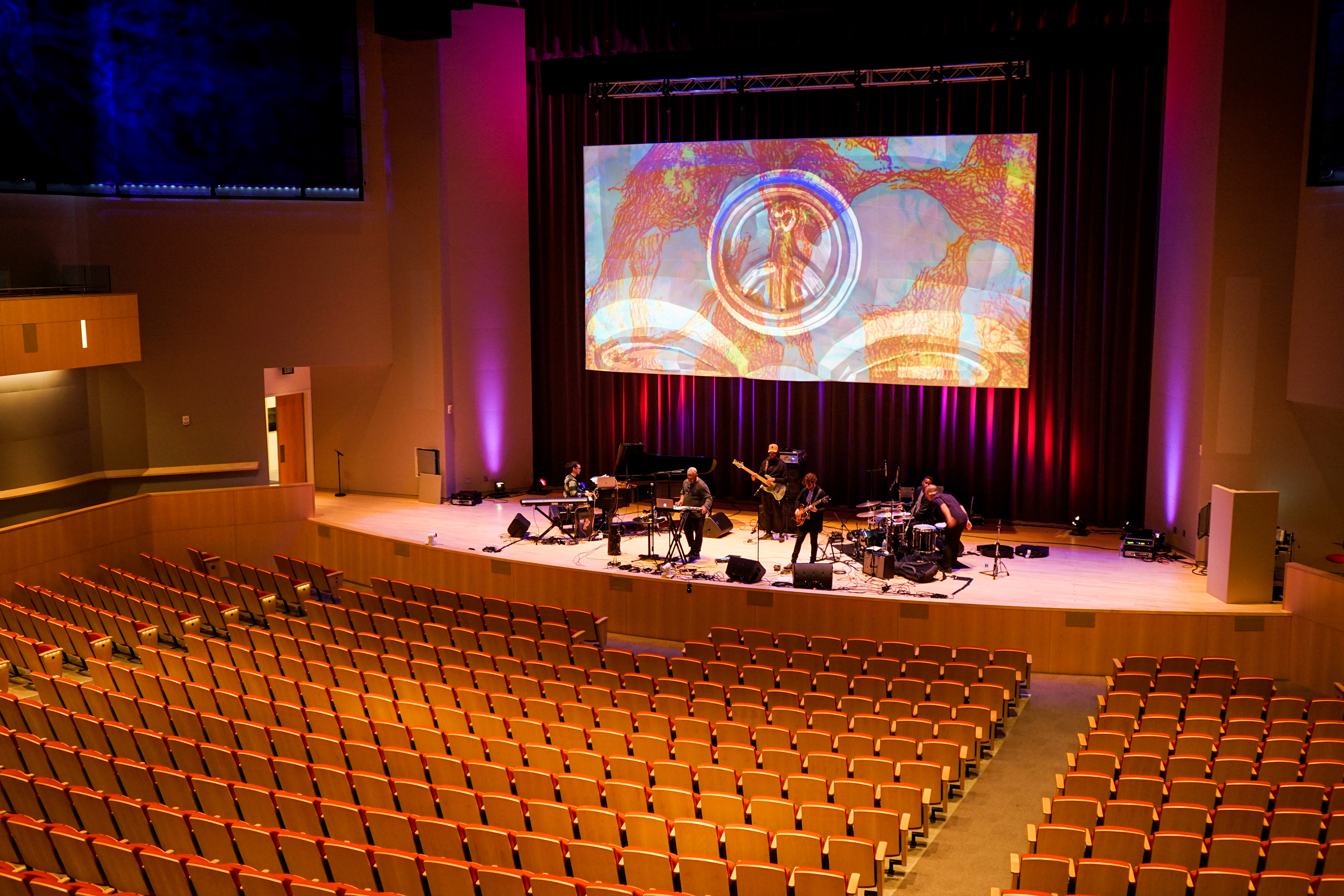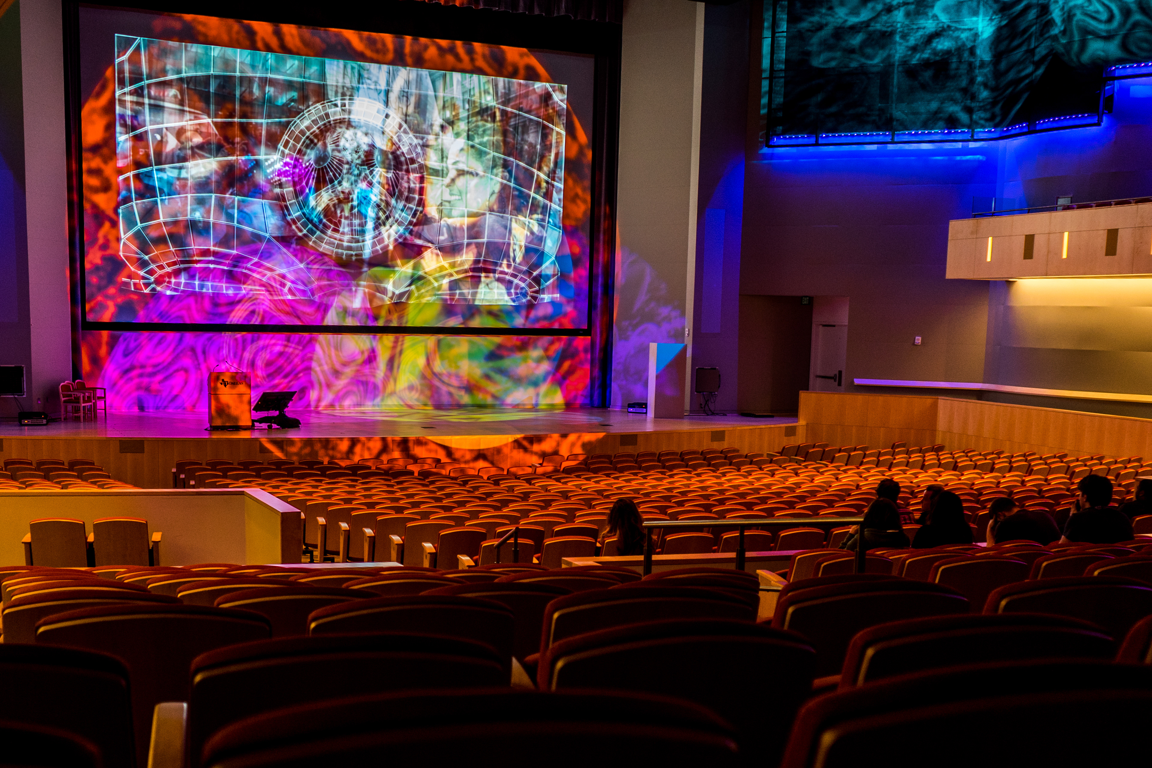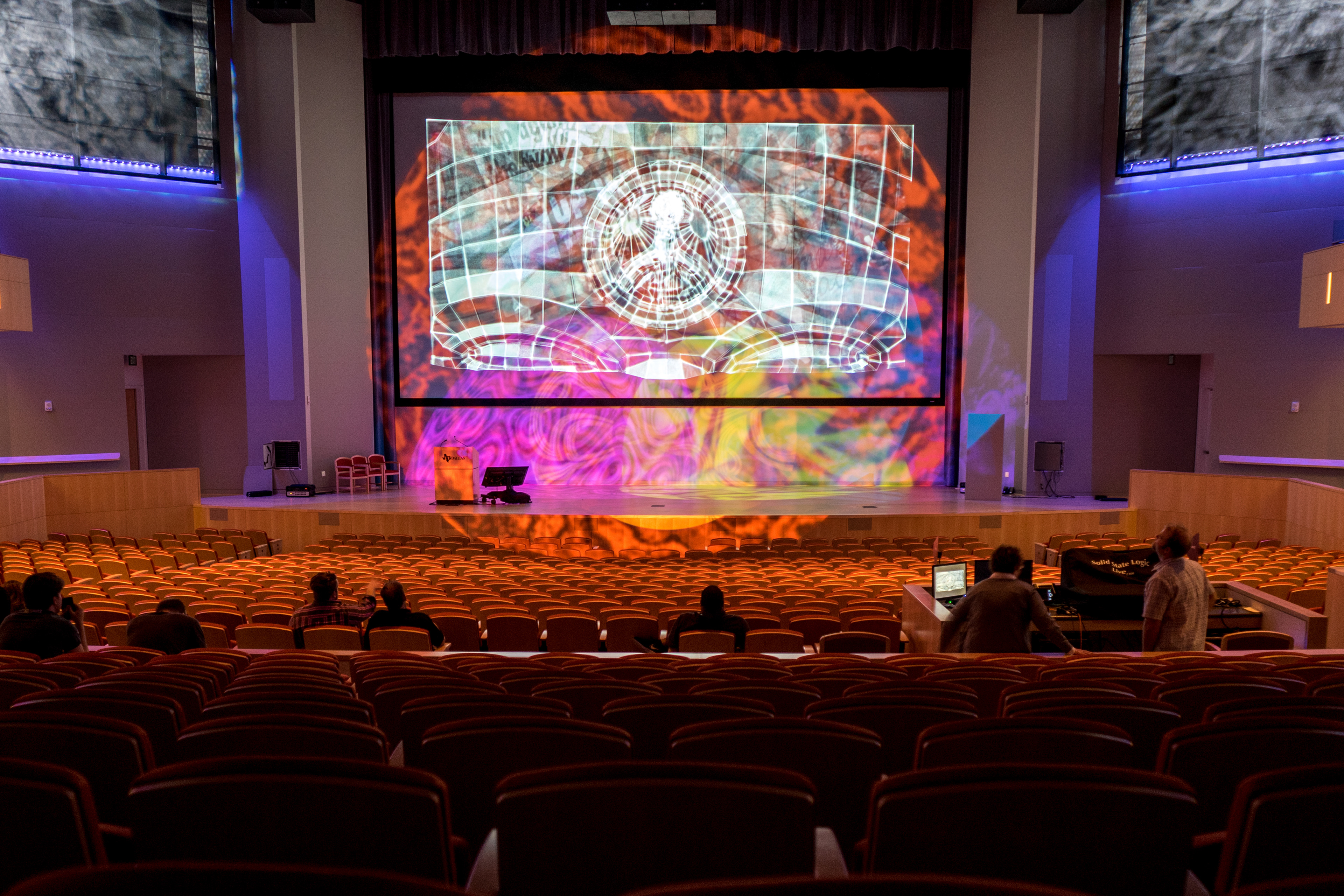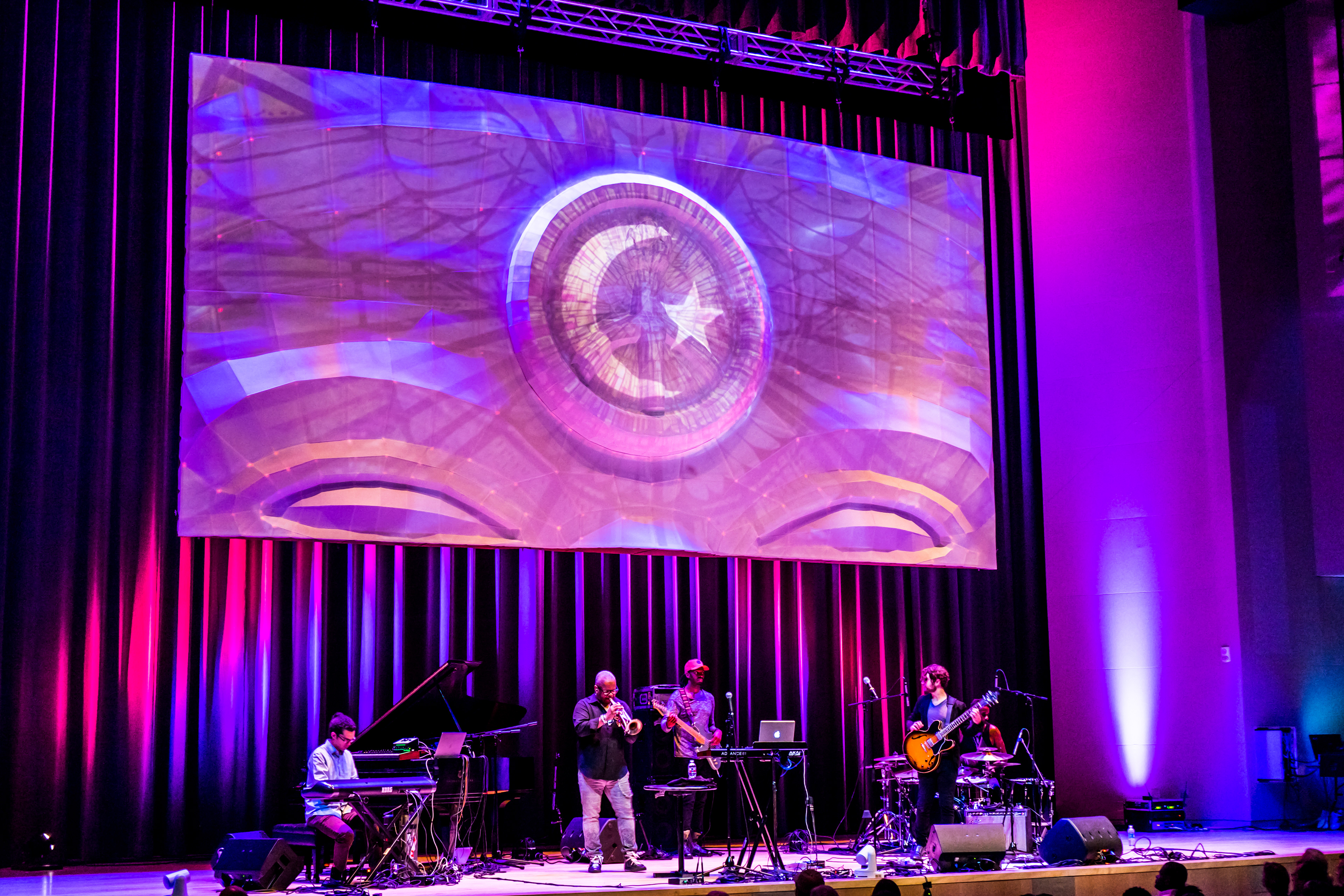ATEC associate professor Andrew Scott discusses the interactive backdrop he and his team built for Grammy Award winner Terence Blanchard's performance on Friday, April 21 2017, in the Edith O'Donnell Arts and Technology Building lecture hall.