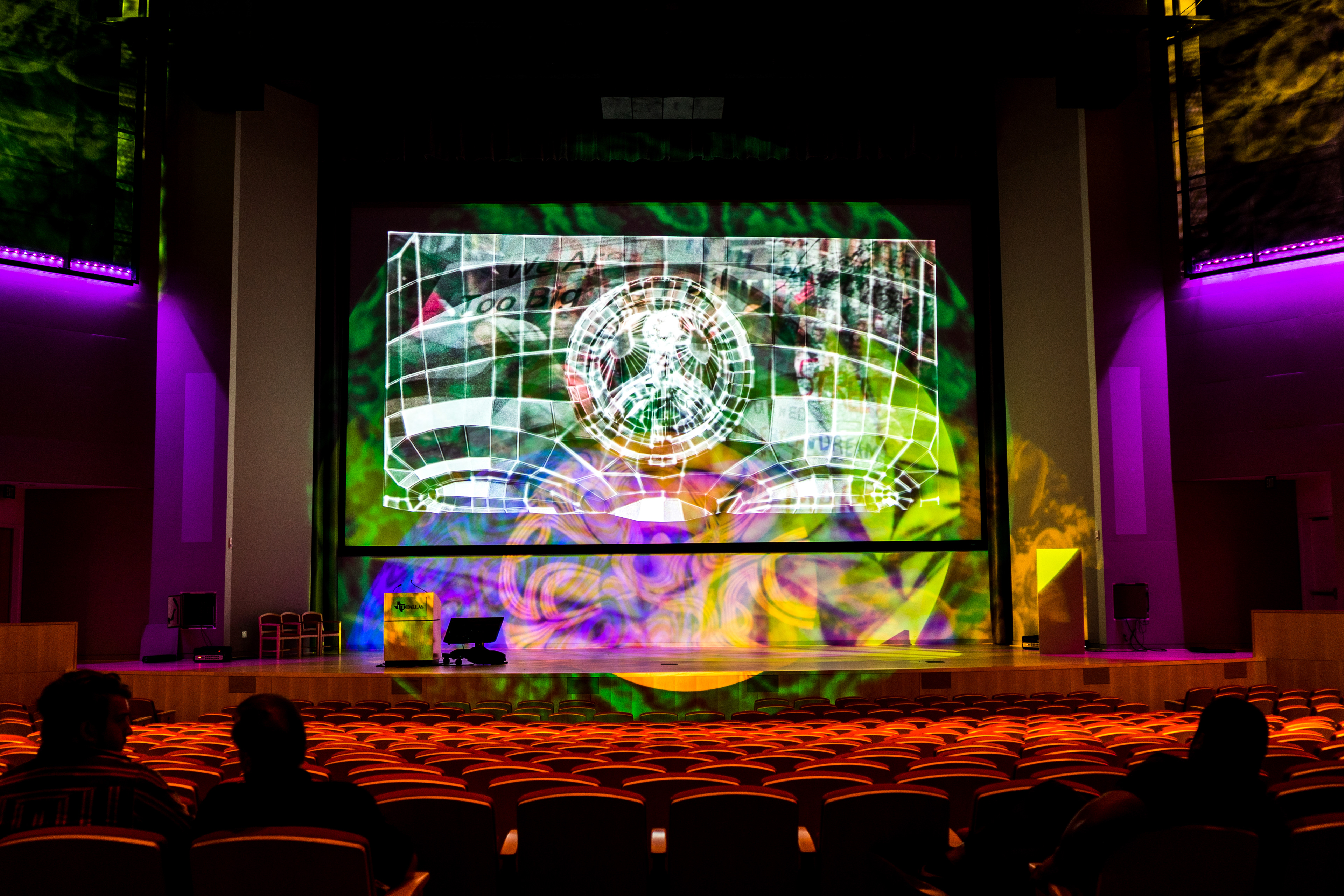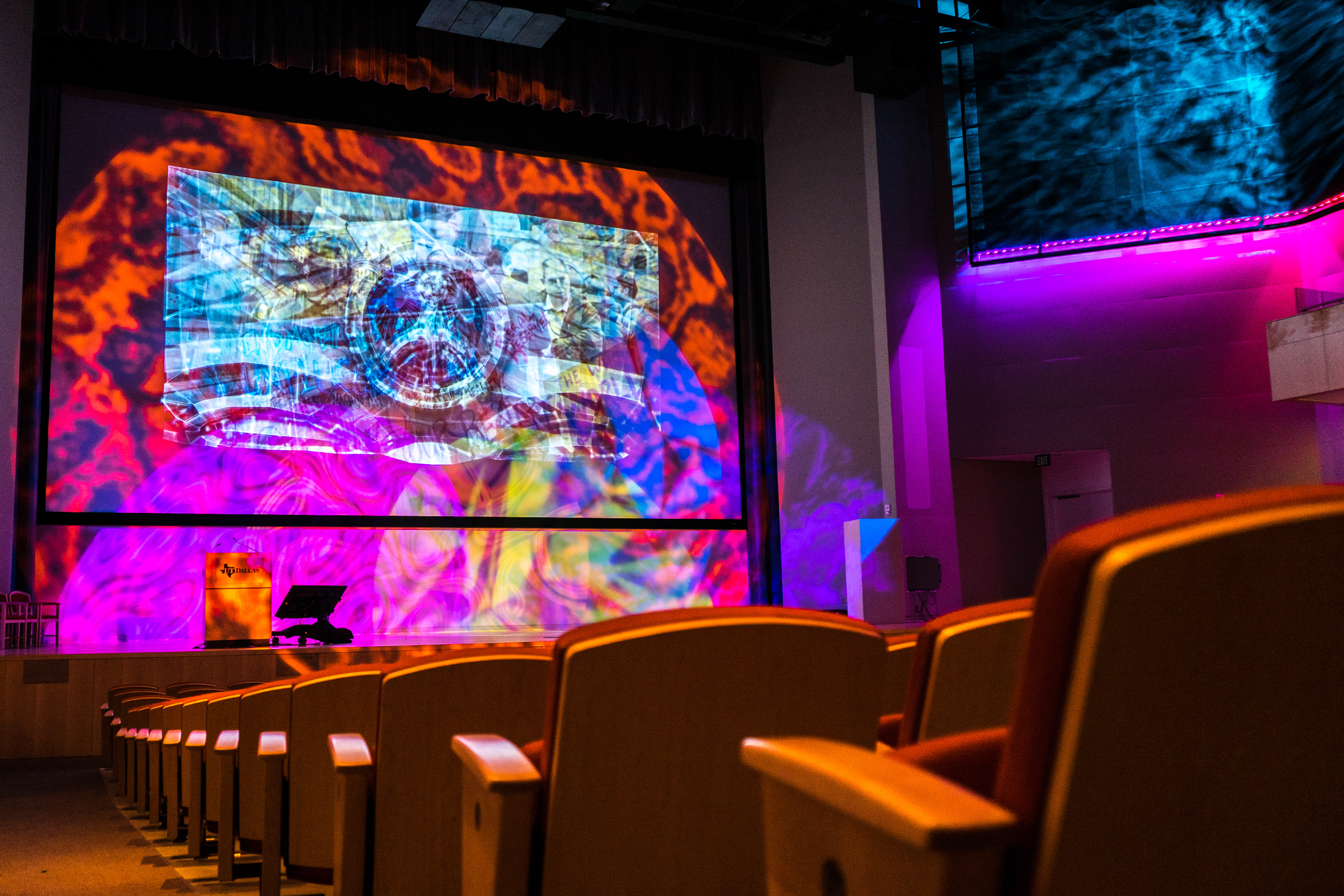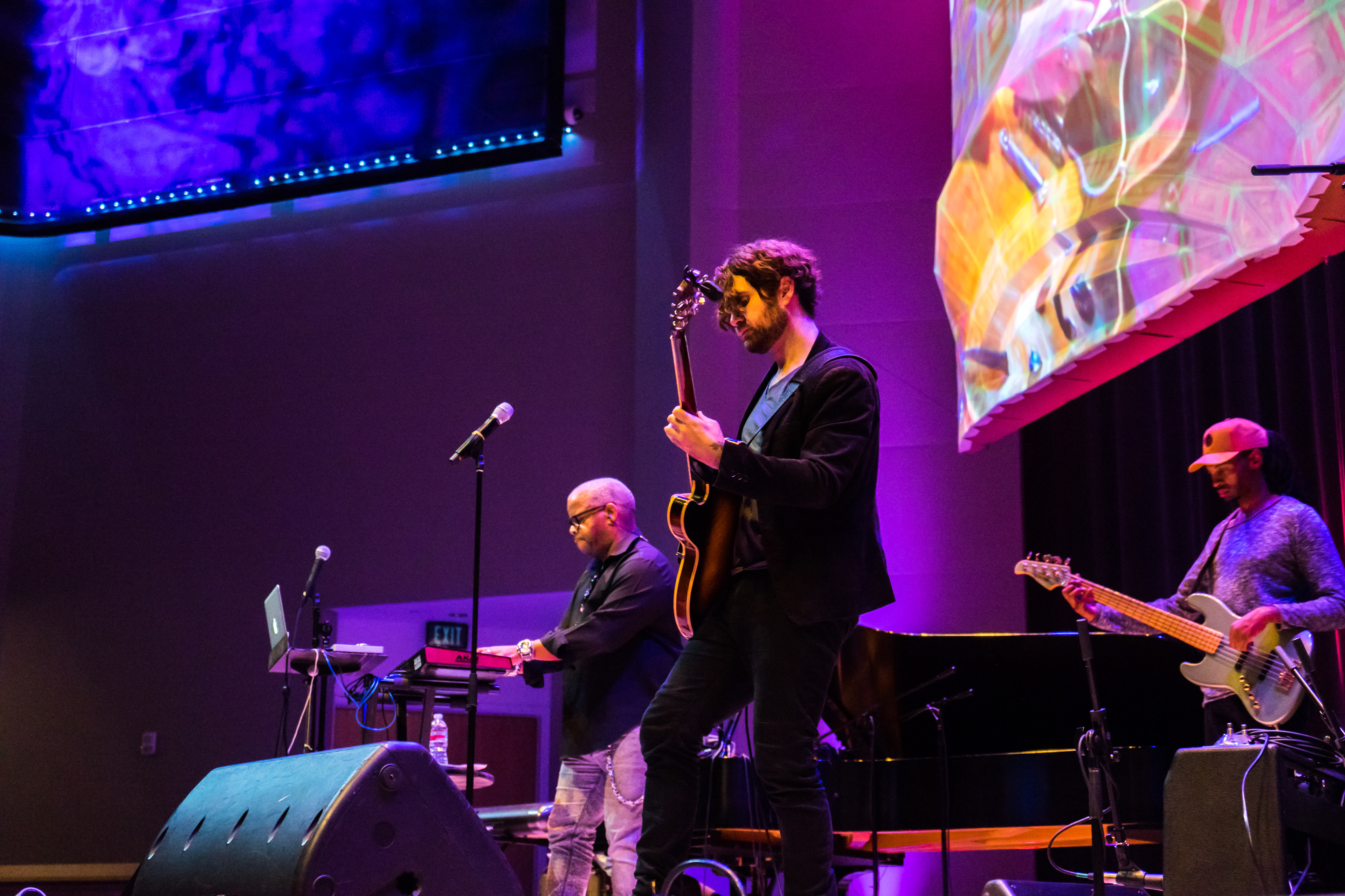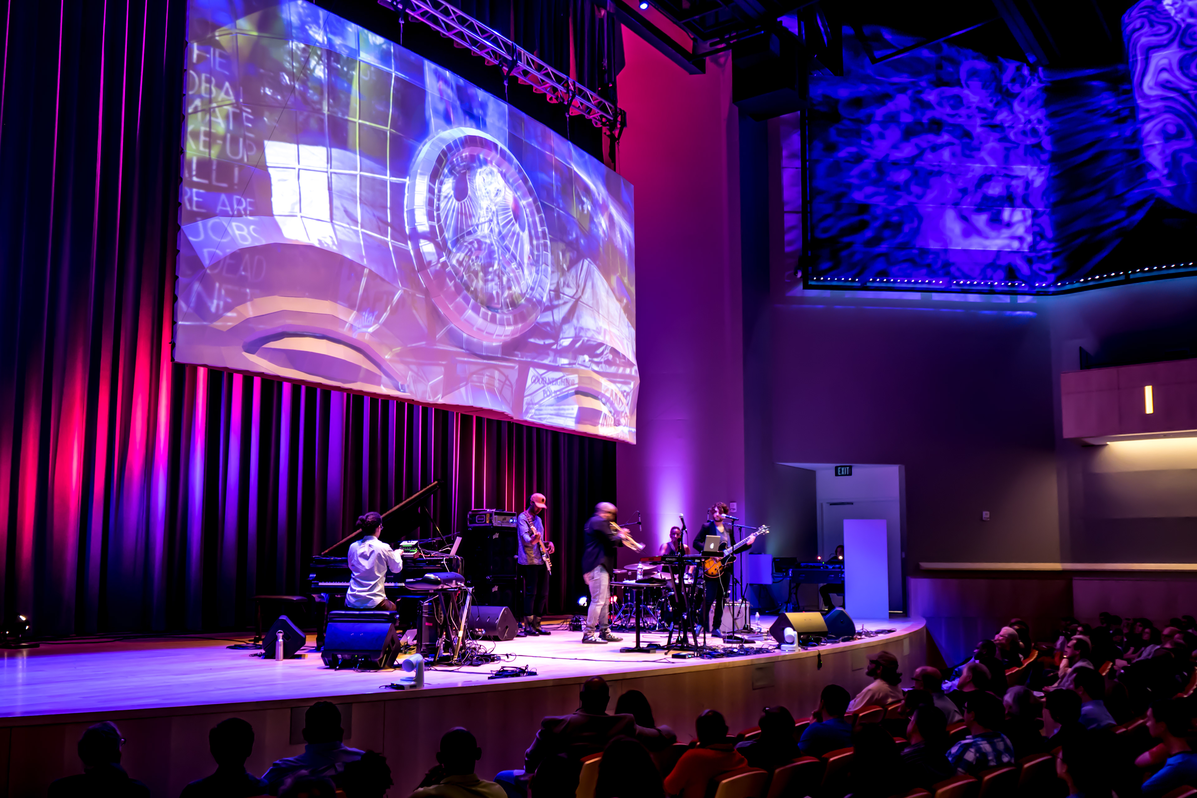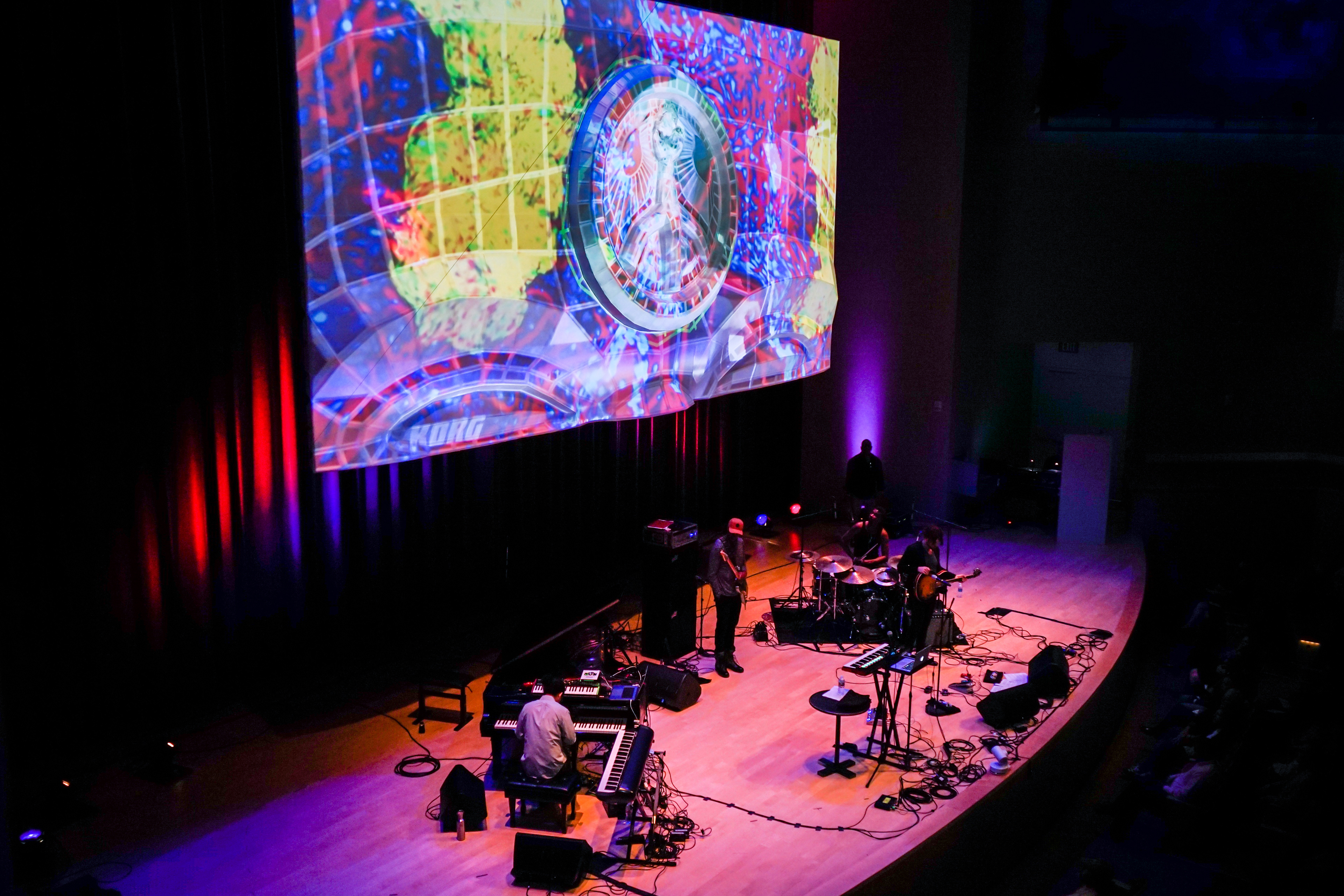 ATEC associate professor Andrew Scott discusses the interactive backdrop he and his team built for Grammy Award winner Terence Blanchard's performance on Friday, April 21 2017, in the Edith O'Donnell Arts and Technology Building lecture hall.