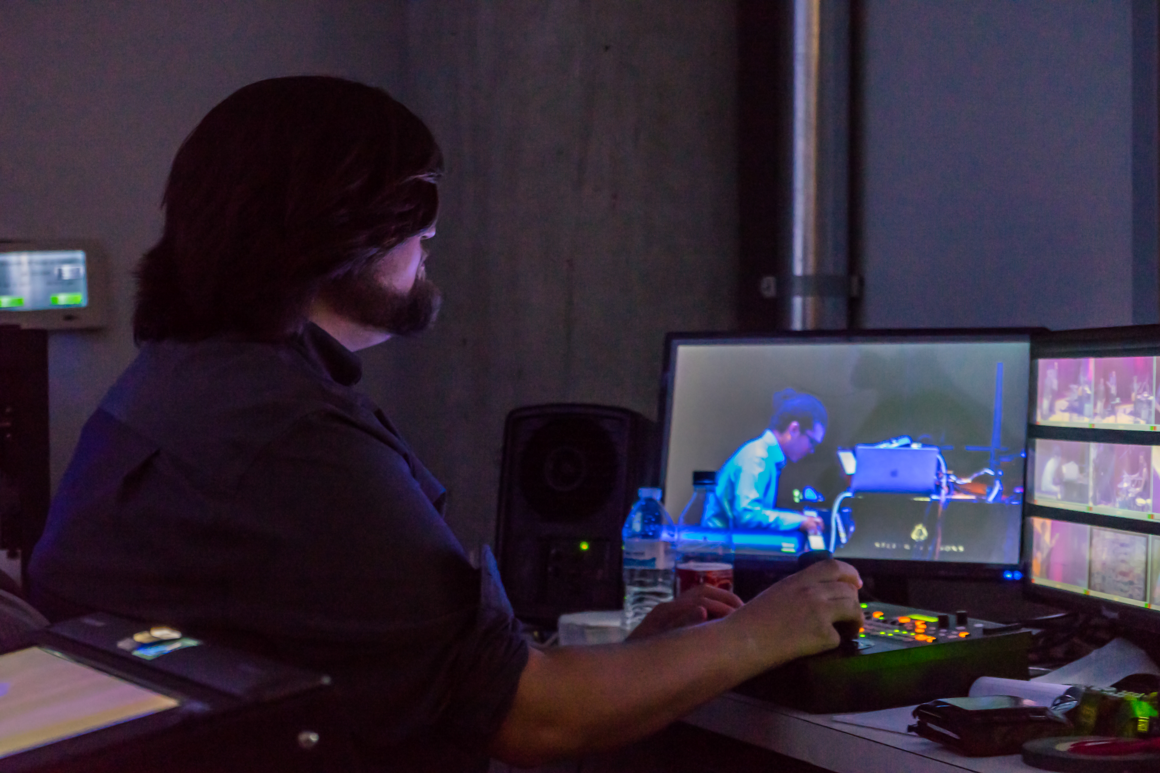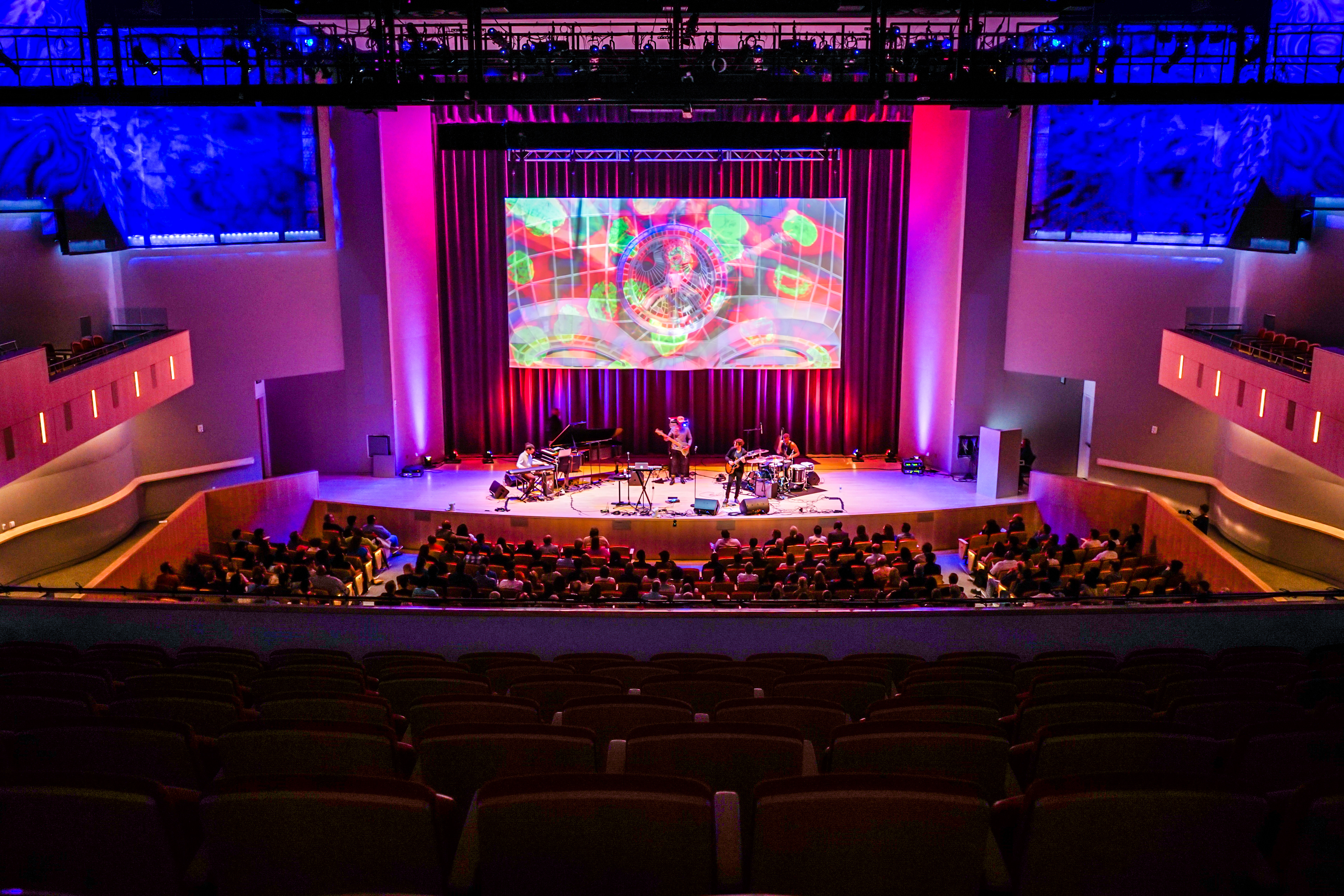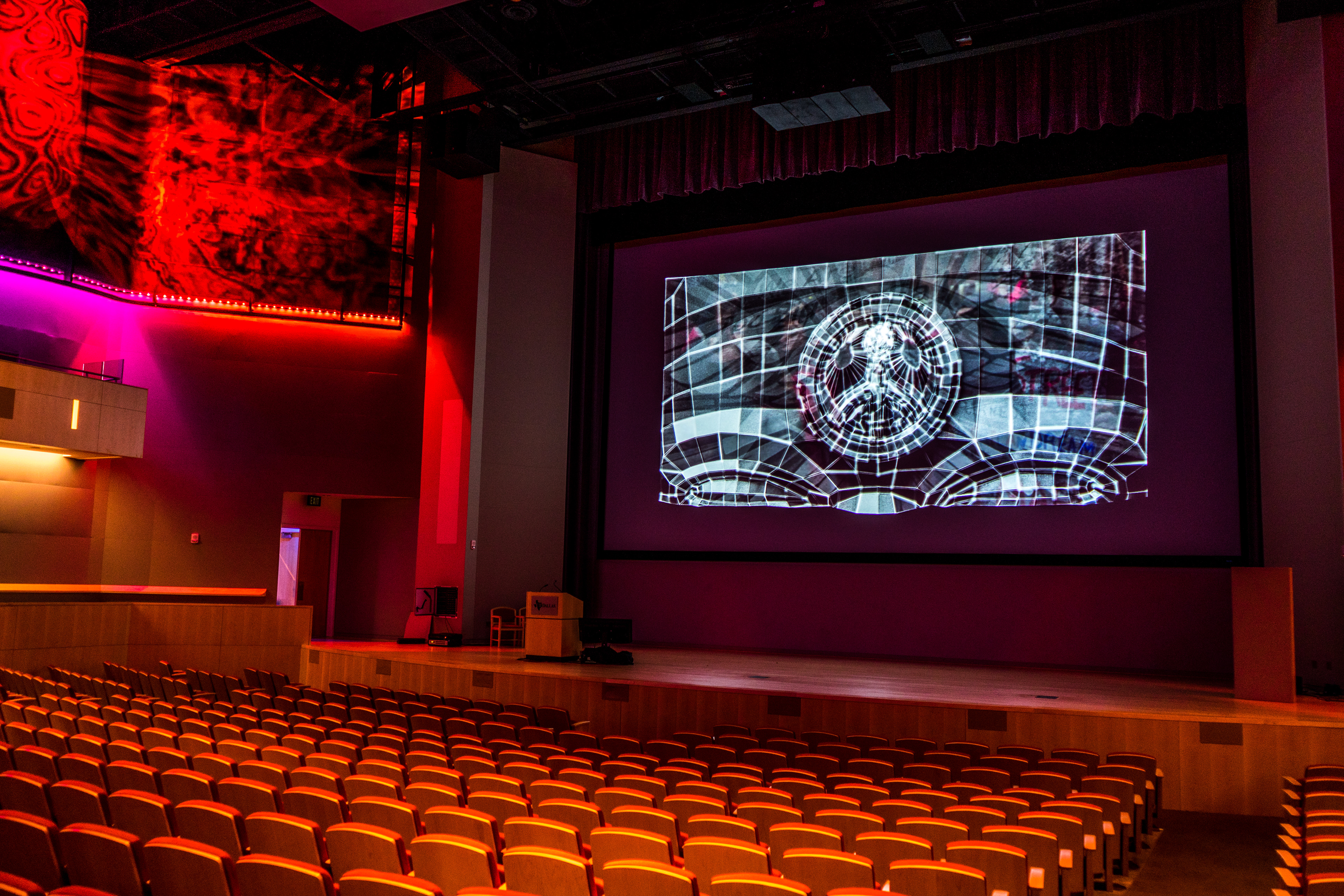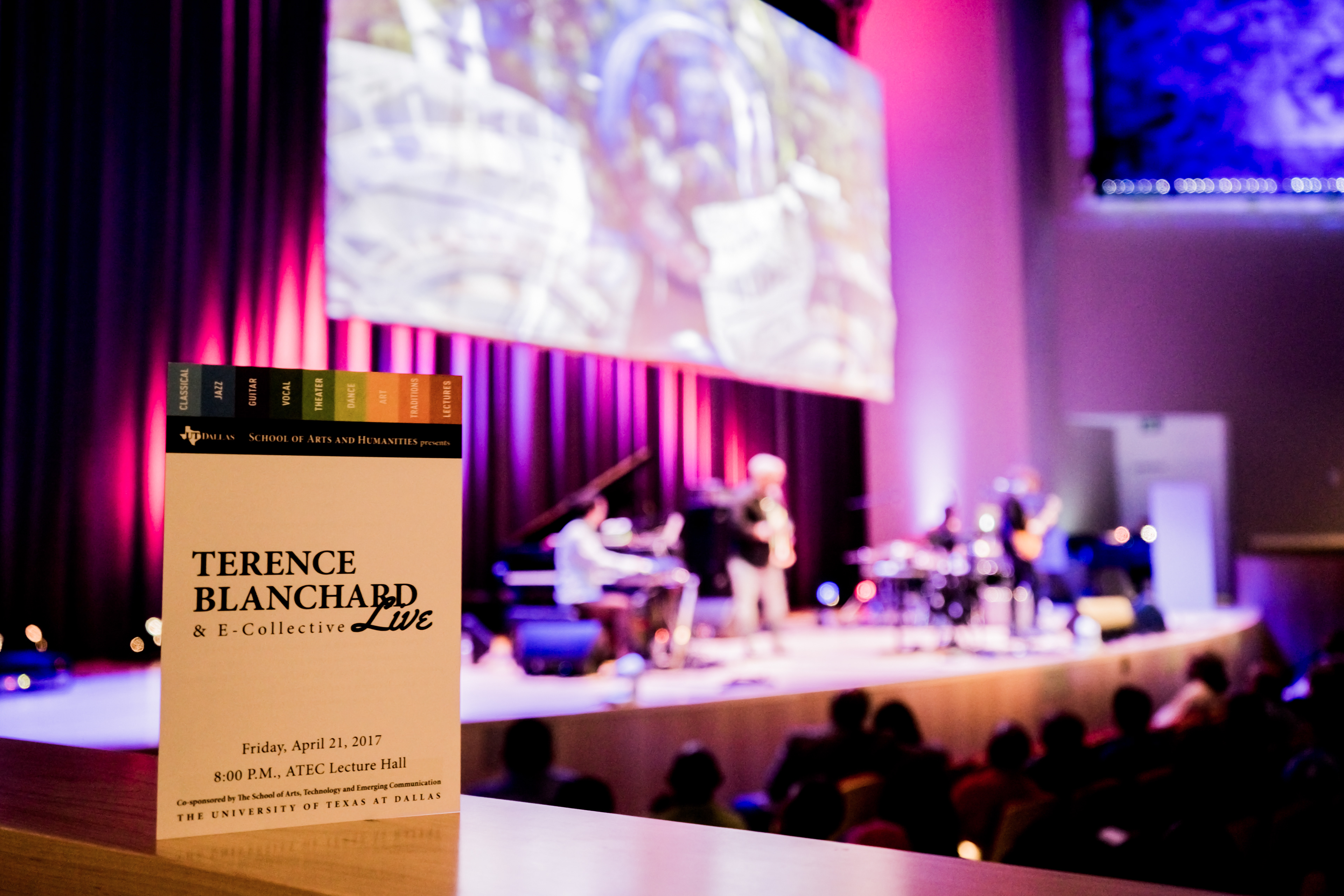 ATEC associate professor Andrew Scott discusses the interactive backdrop he and his team built for Grammy Award winner Terence Blanchard's performance on Friday, April 21 2017, in the Edith O'Donnell Arts and Technology Building lecture hall.