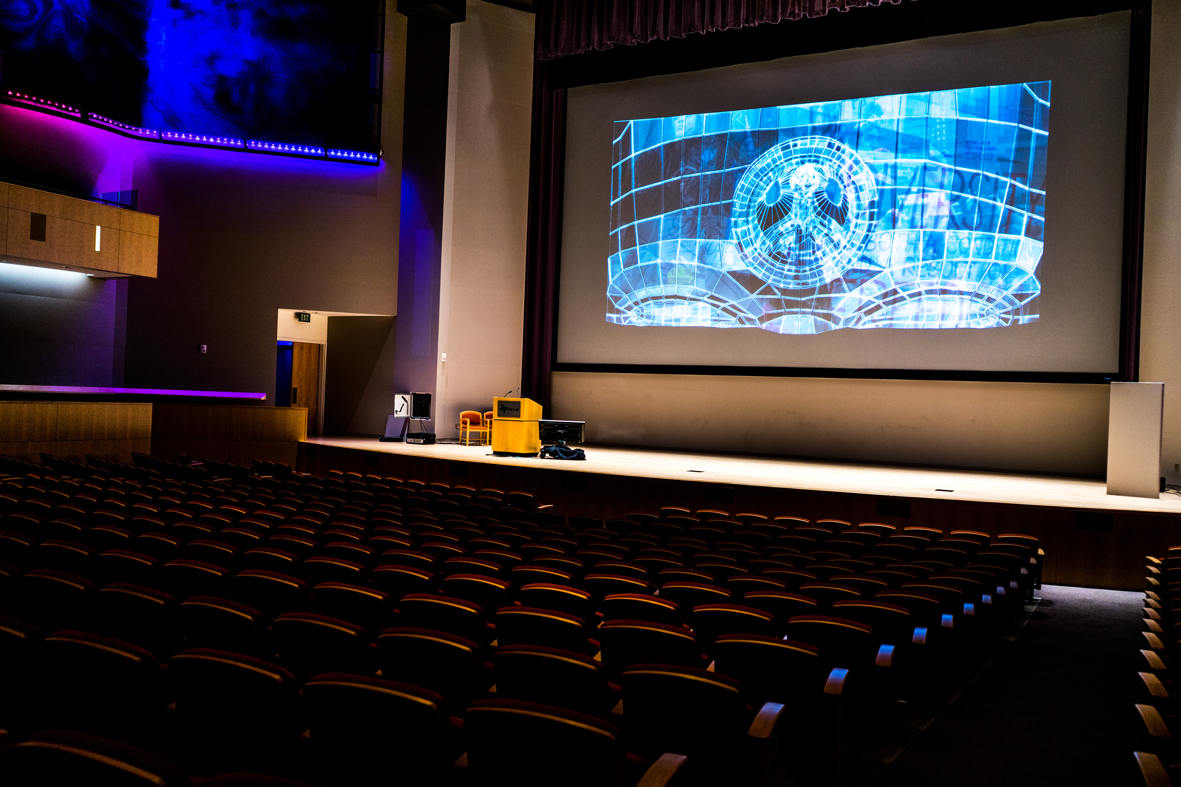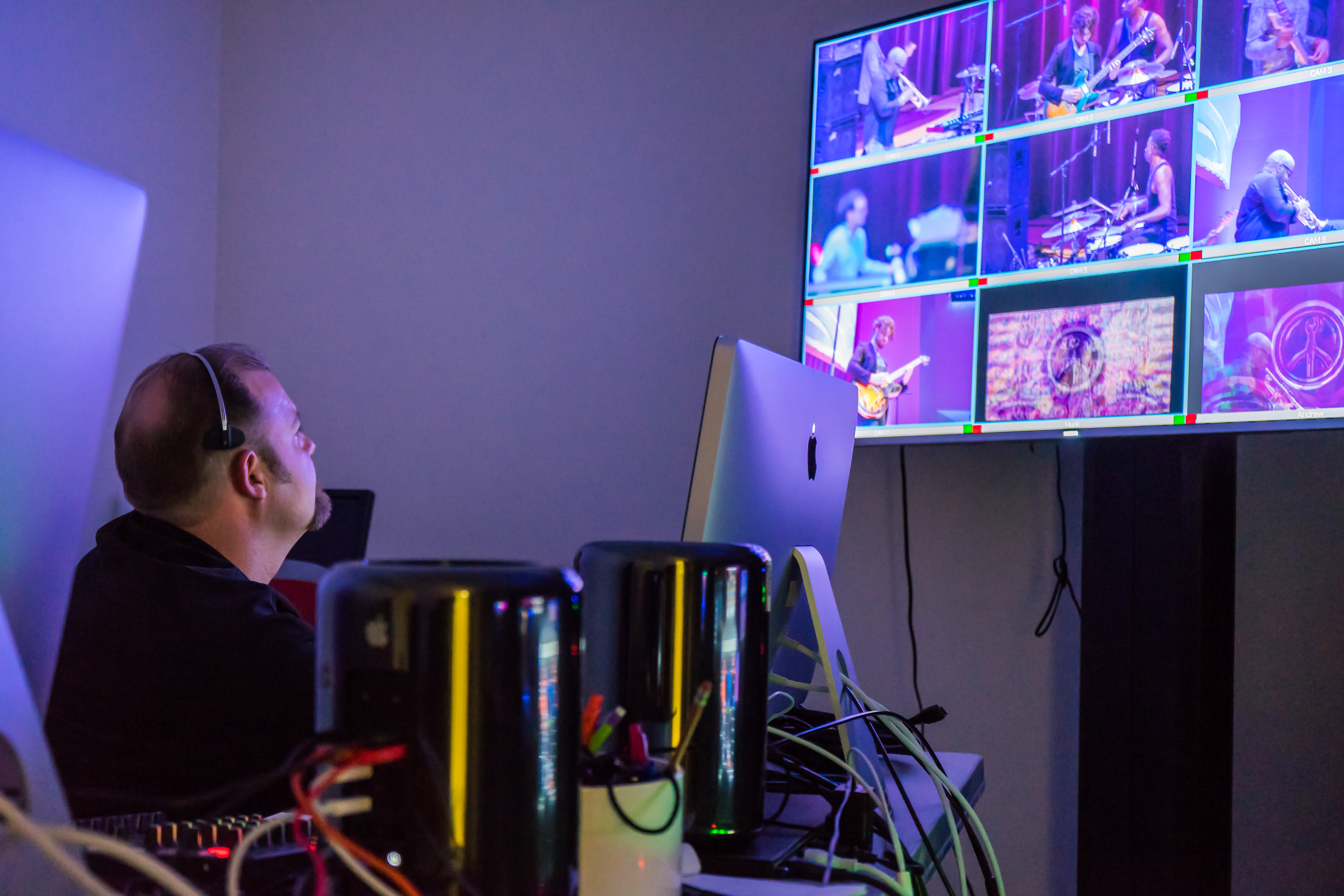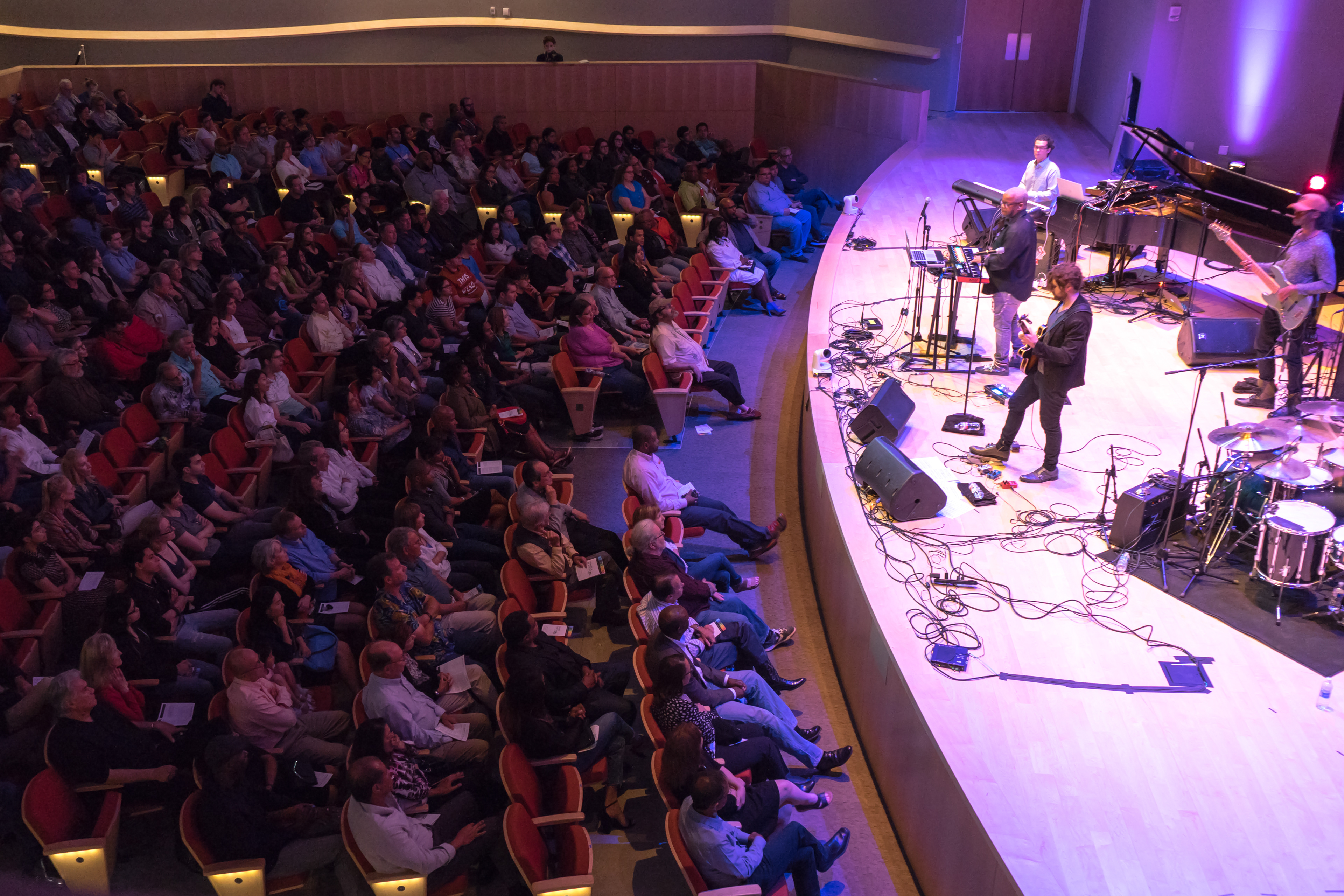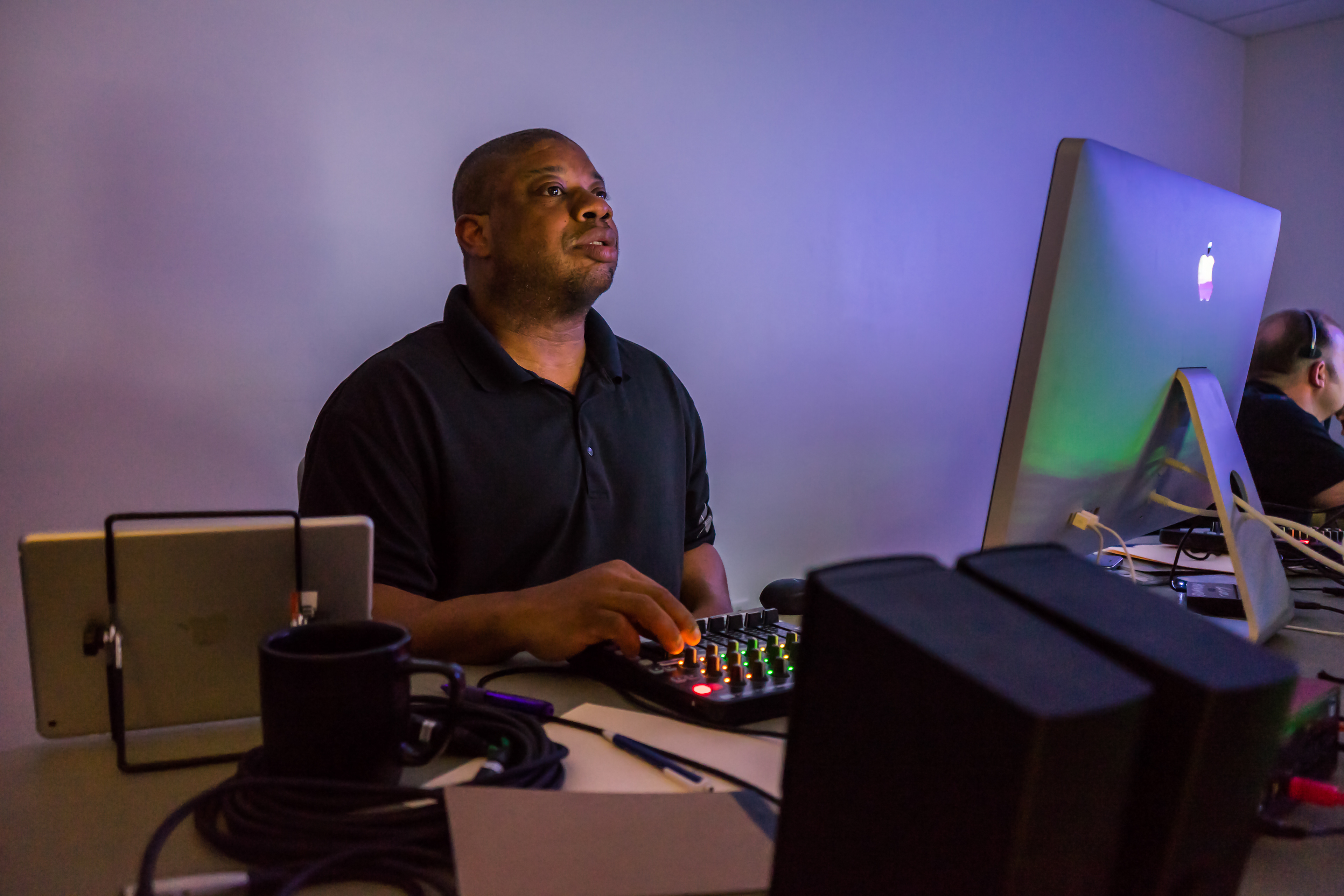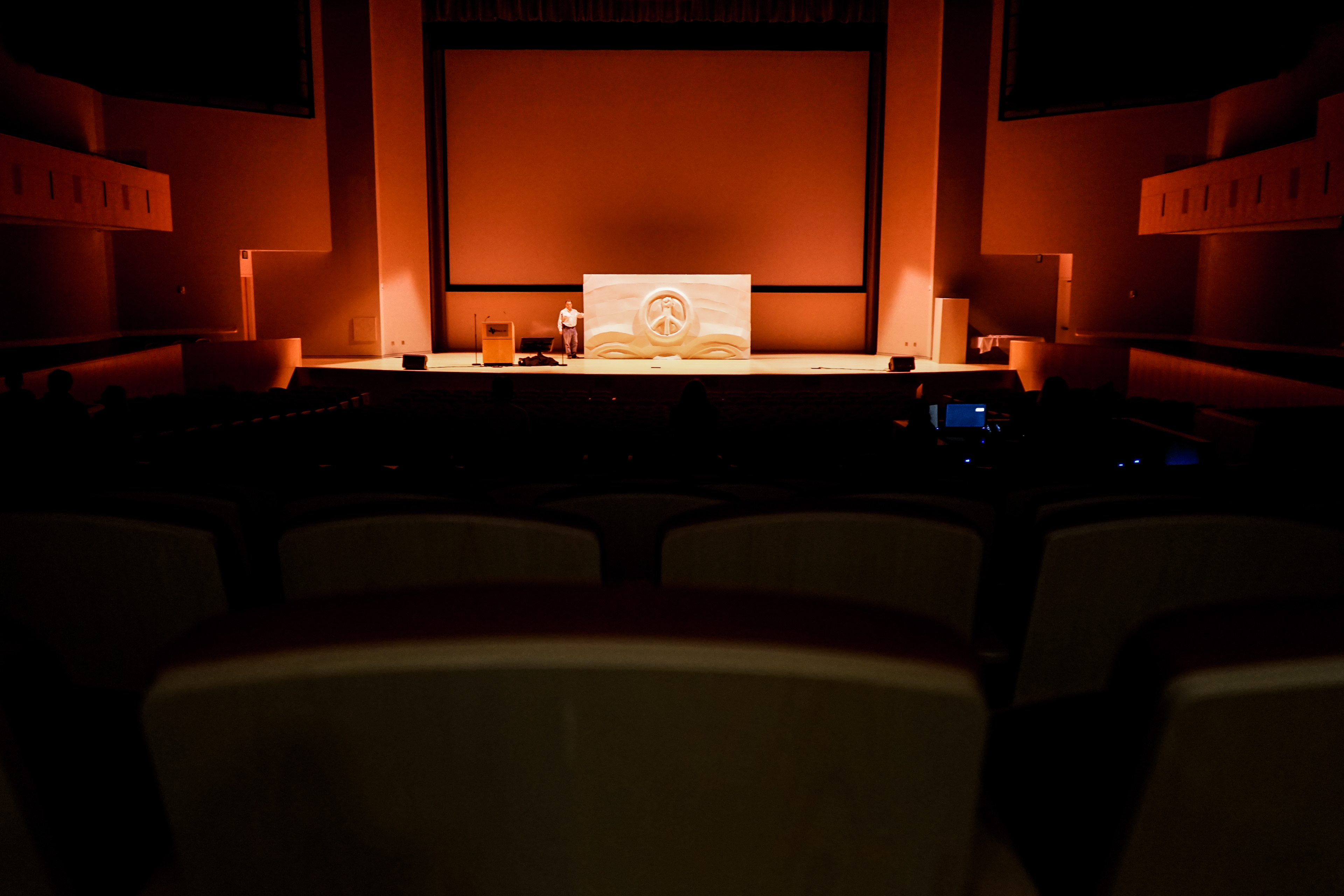 ATEC associate professor Andrew Scott discusses the interactive backdrop he and his team built for Grammy Award winner Terence Blanchard's performance on Friday, April 21 2017, in the Edith O'Donnell Arts and Technology Building lecture hall.