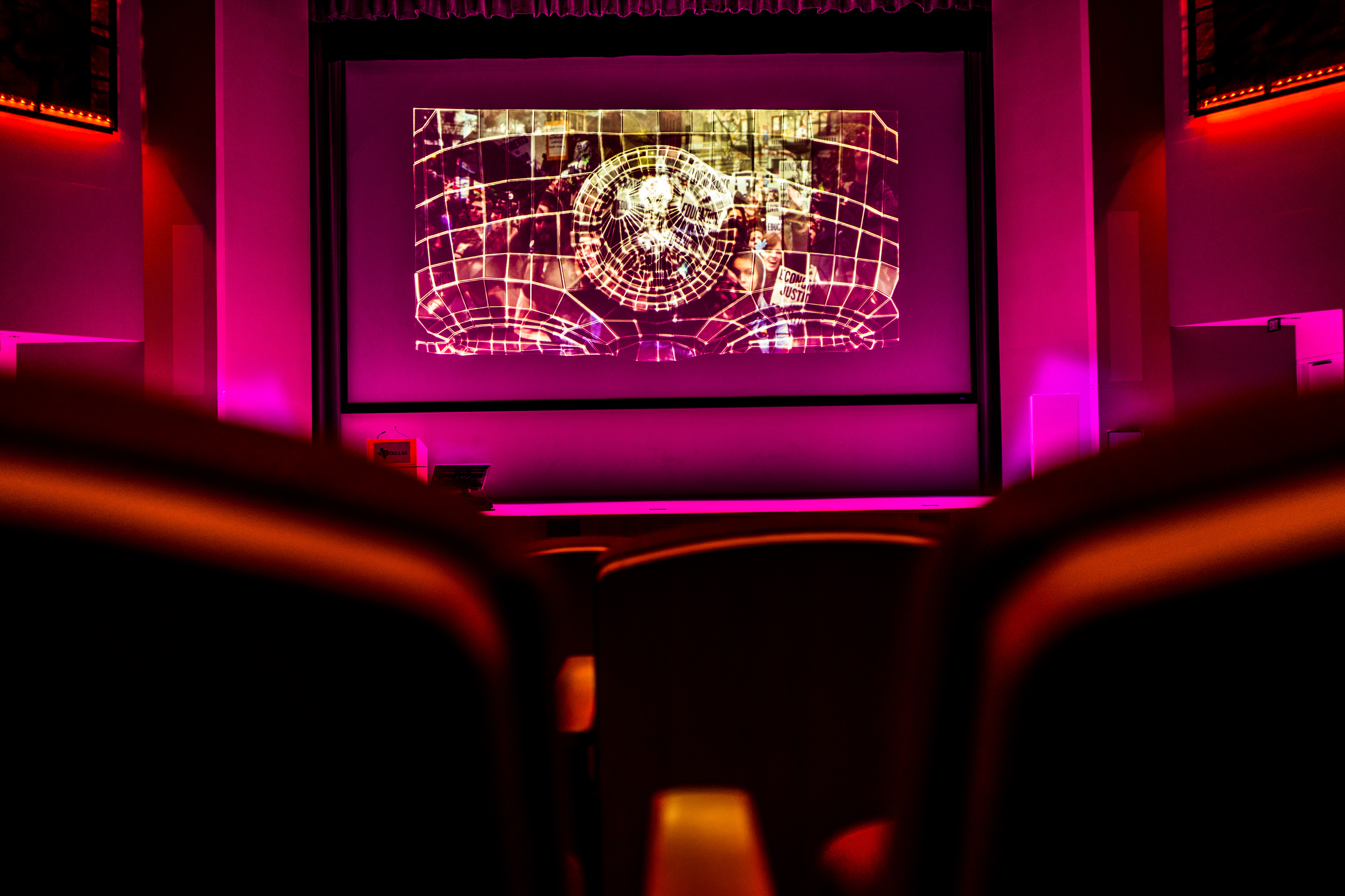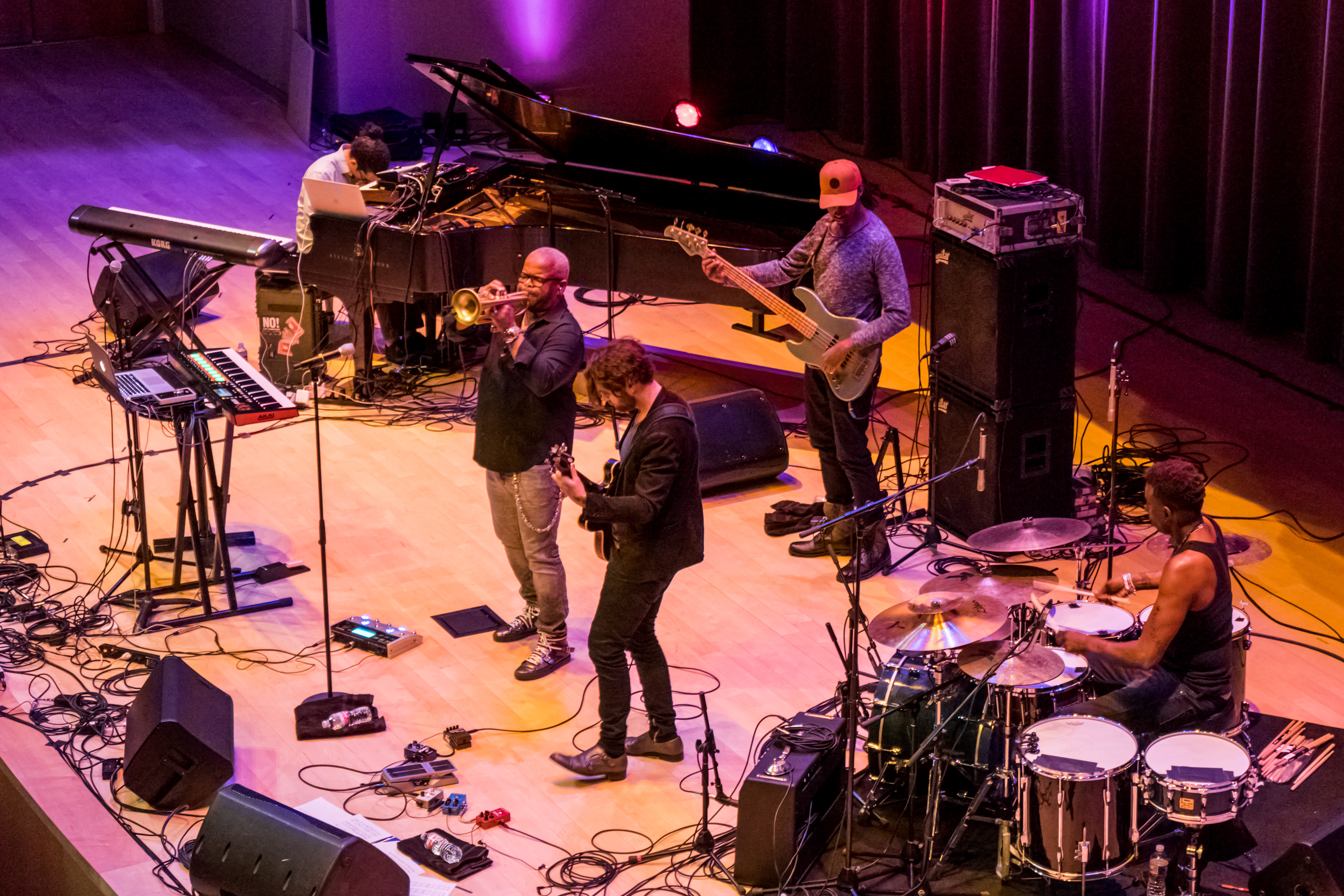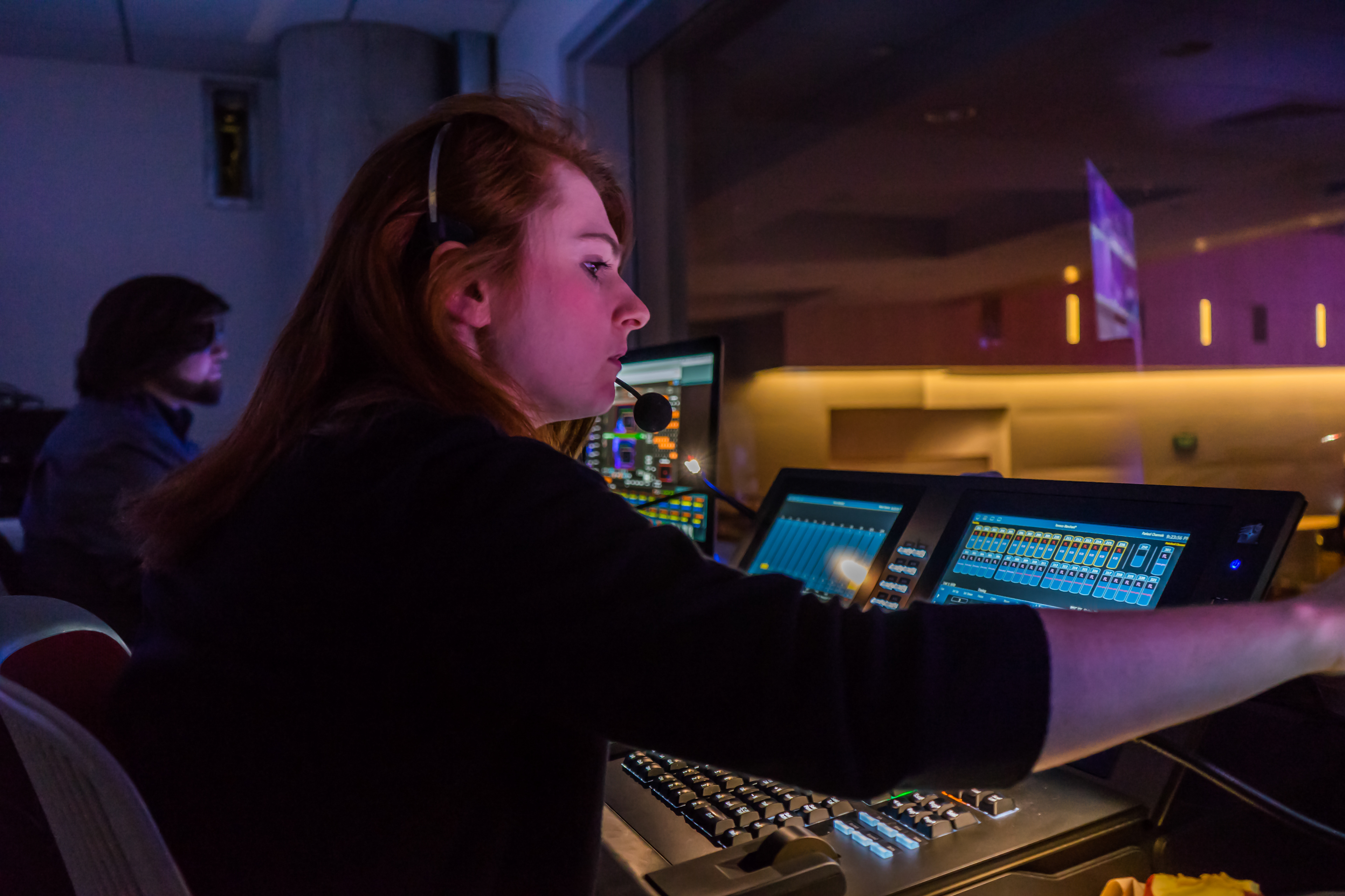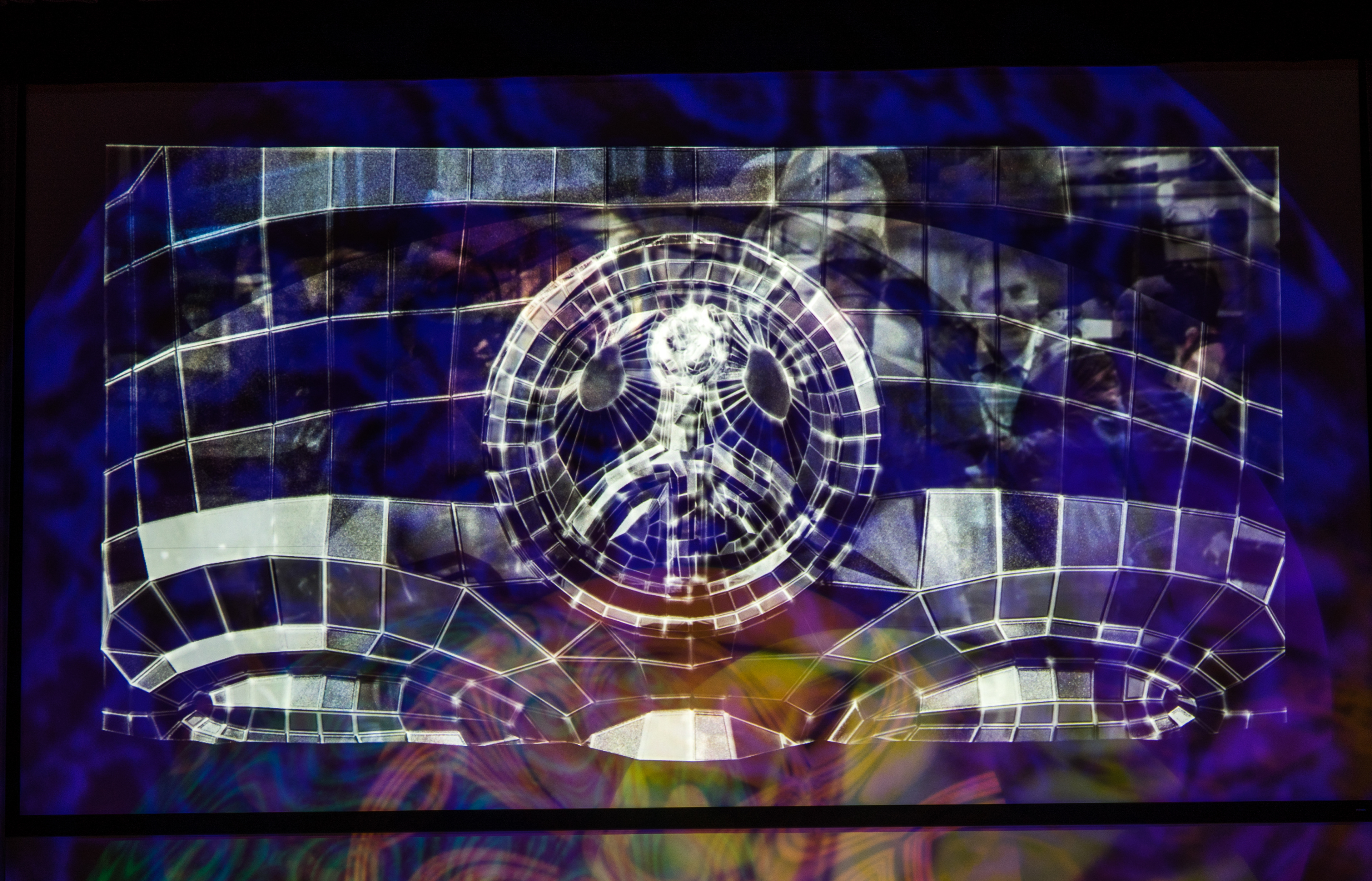 ATEC associate professor Andrew Scott discusses the interactive backdrop he and his team built for Grammy Award winner Terence Blanchard's performance on Friday, April 21 2017, in the Edith O'Donnell Arts and Technology Building lecture hall.