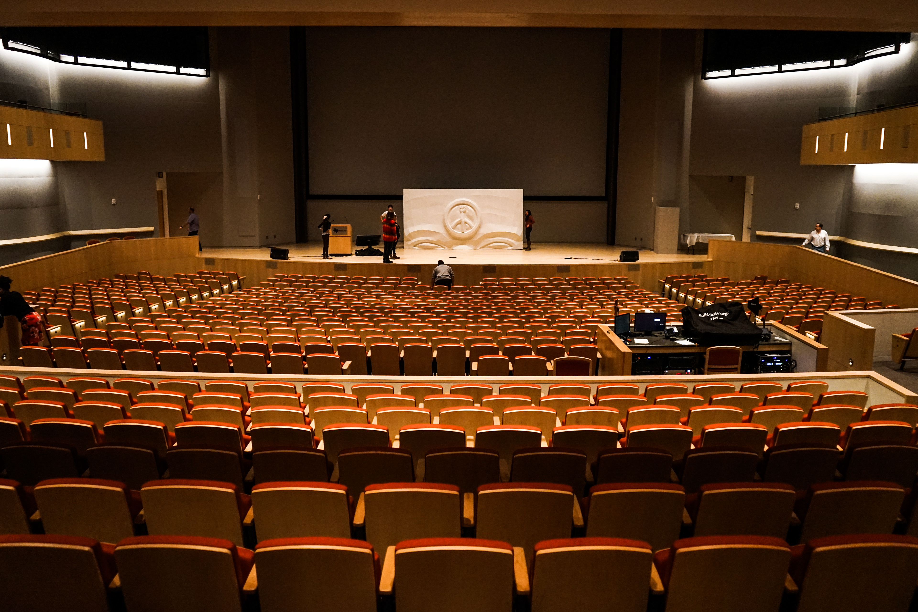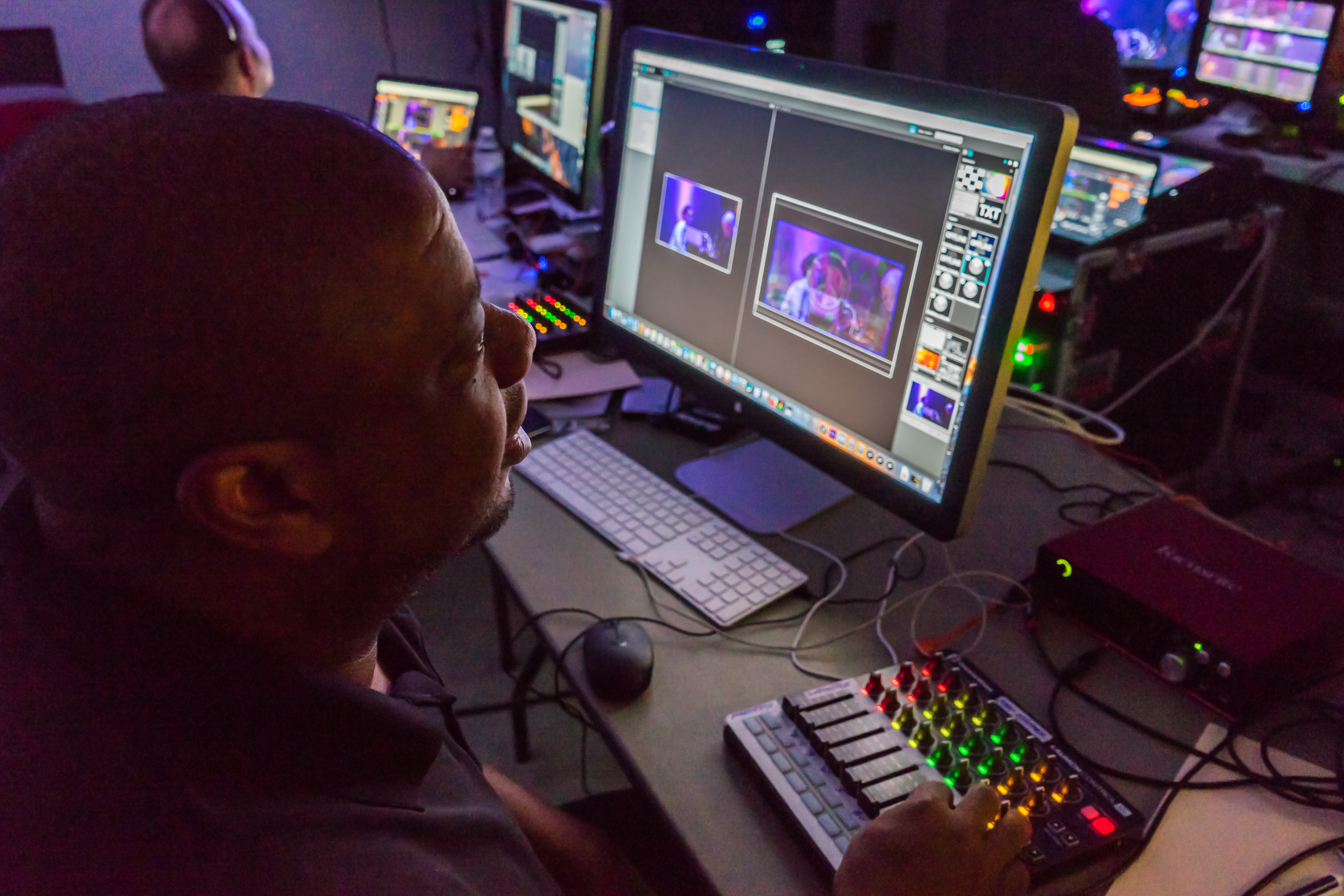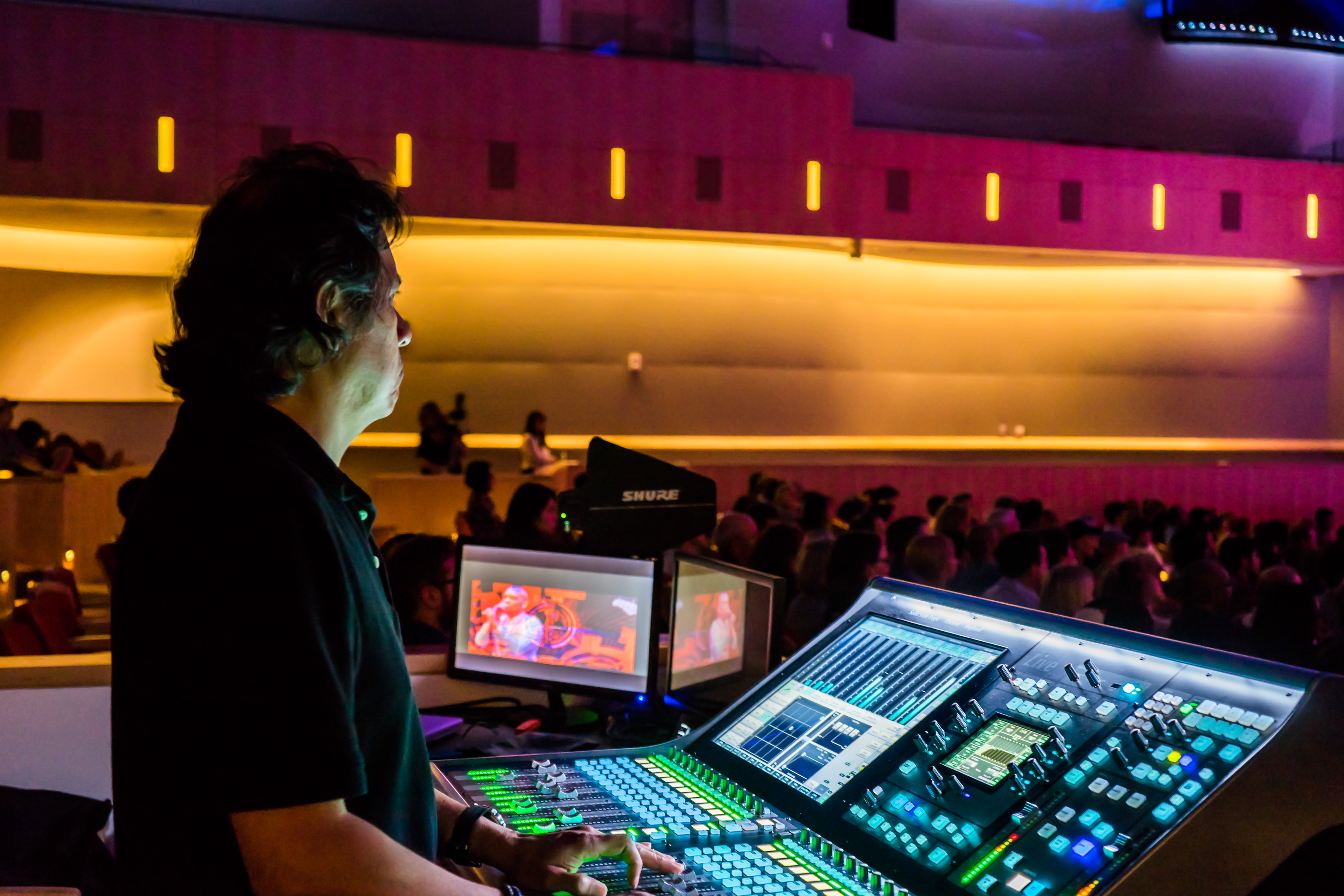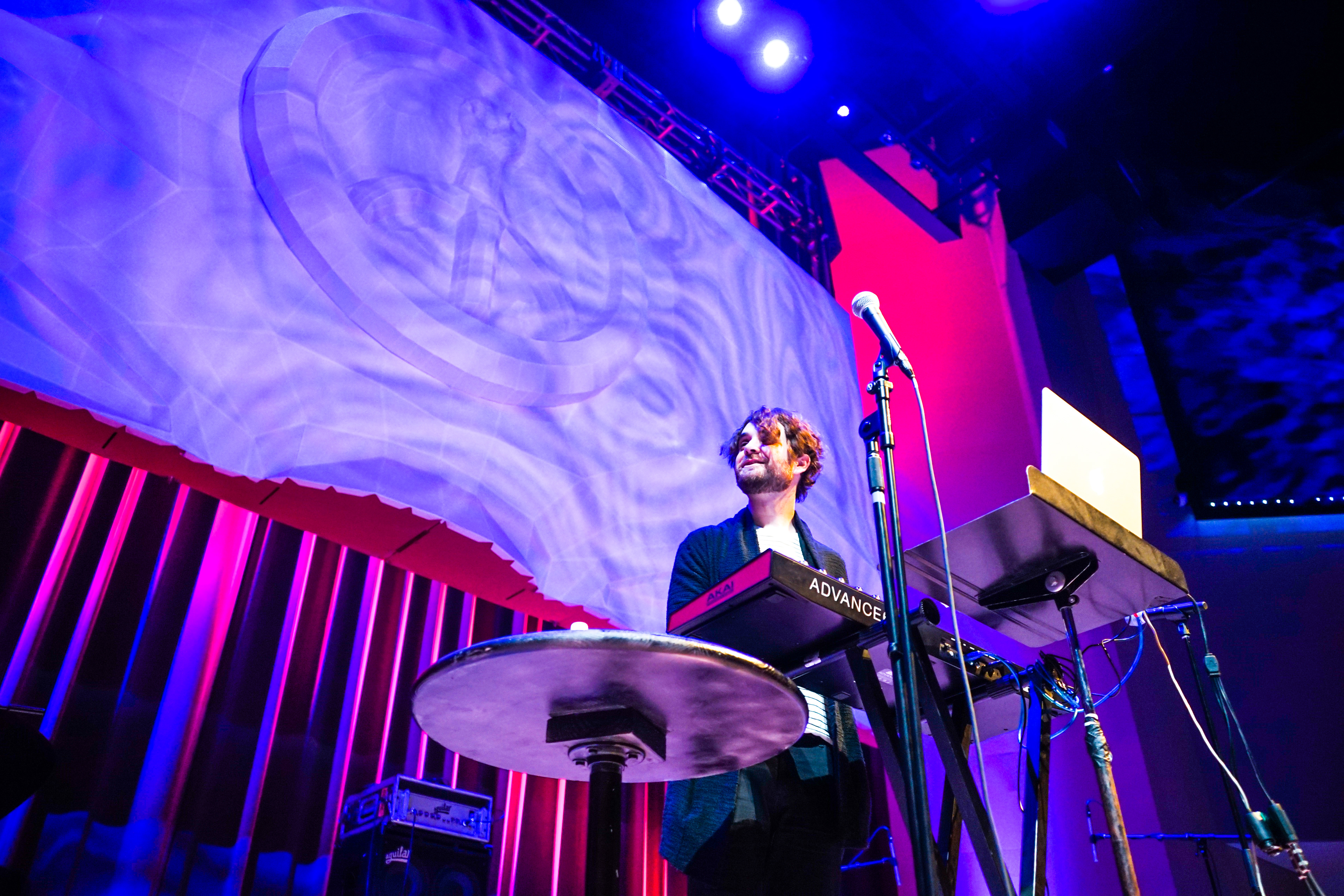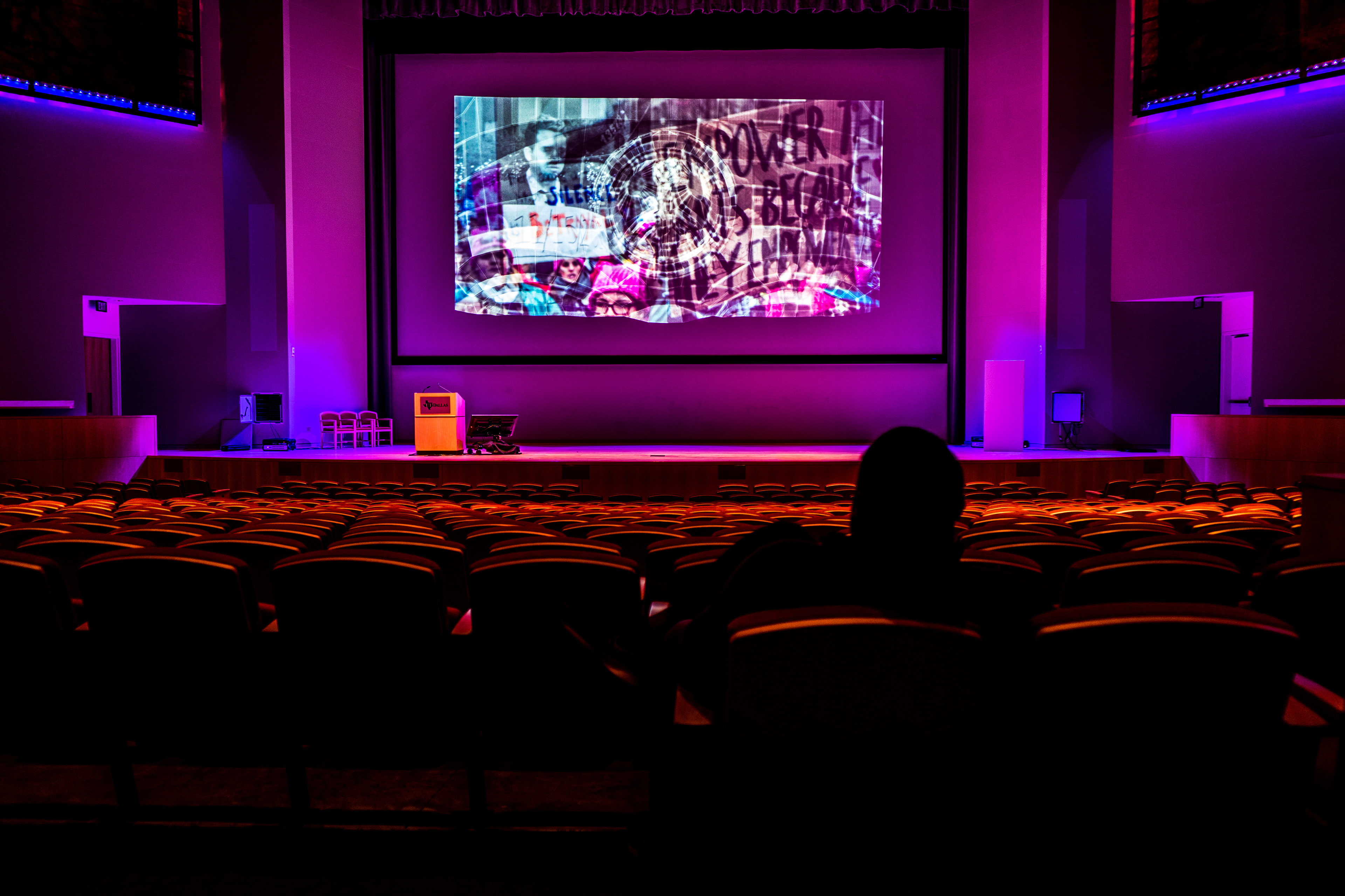 ATEC associate professor Andrew Scott discusses the interactive backdrop he and his team built for Grammy Award winner Terence Blanchard's performance on Friday, April 21 2017, in the Edith O'Donnell Arts and Technology Building lecture hall.